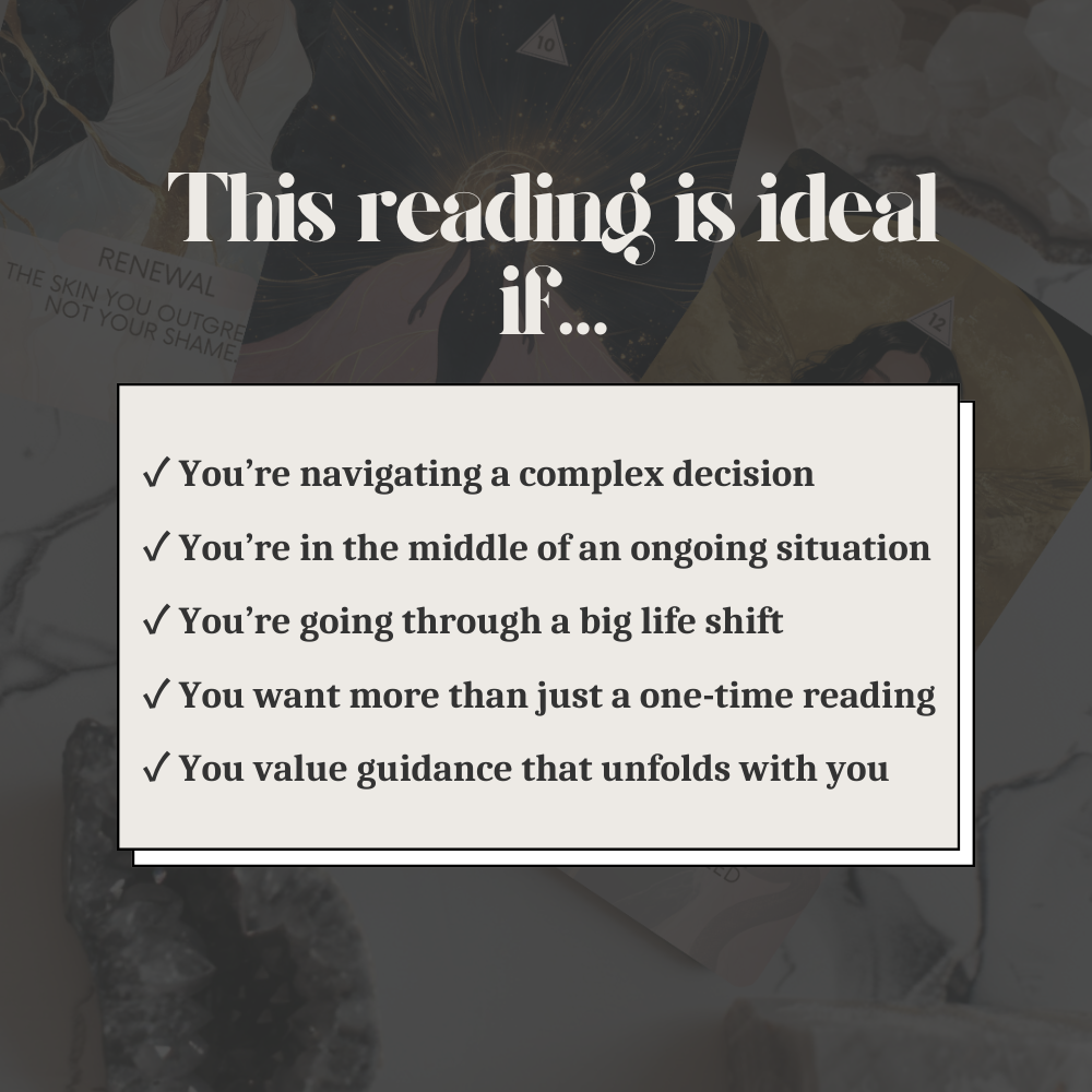 This package is perfect for anyone navigating a complex decision, ongoing situation, or big life shift, who wants more than just a one-time reading. It’s guidance that unfolds with you — because your journey deserves attention at every stage.
