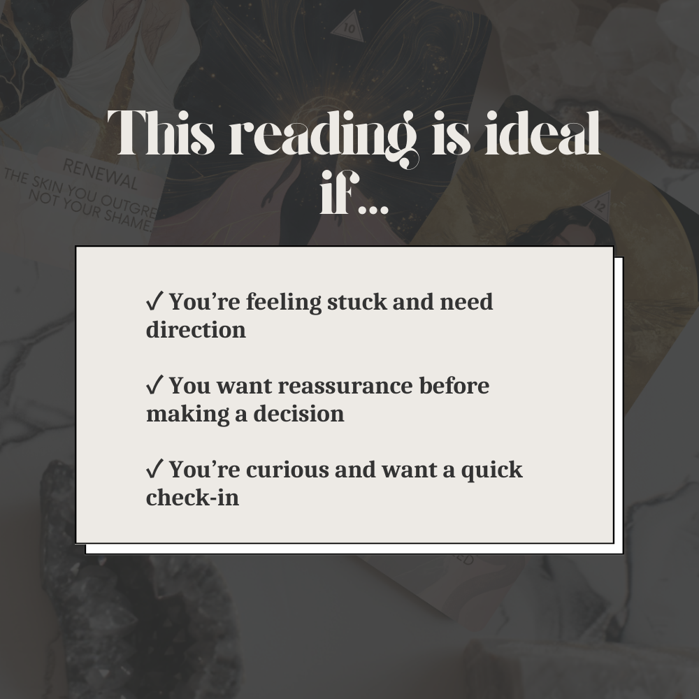 This reading is ideal for anyone seeking fast, focused guidance, whether you’re feeling stuck, curious, or just want reassurance before making a decision.